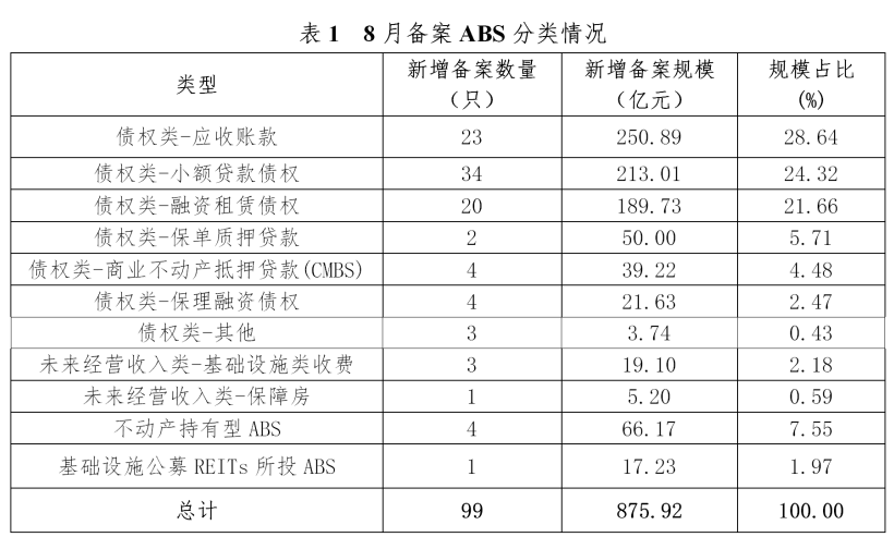 中基协:8月资产支持专项计划新增备案99只 新增备案规模合计875.92亿元